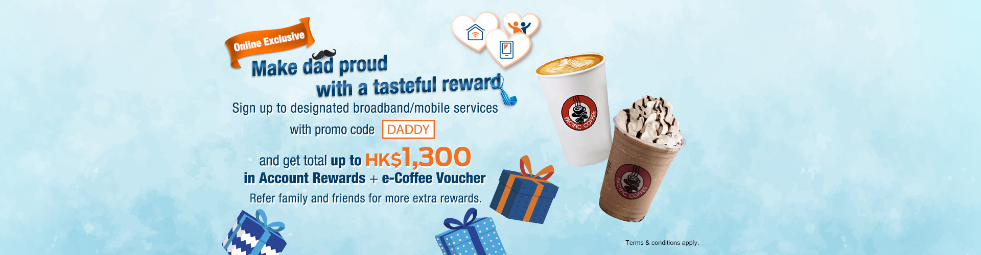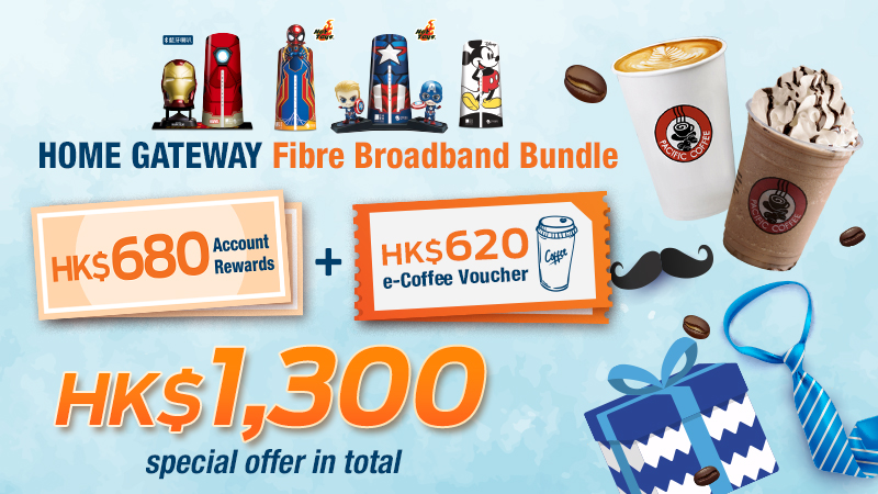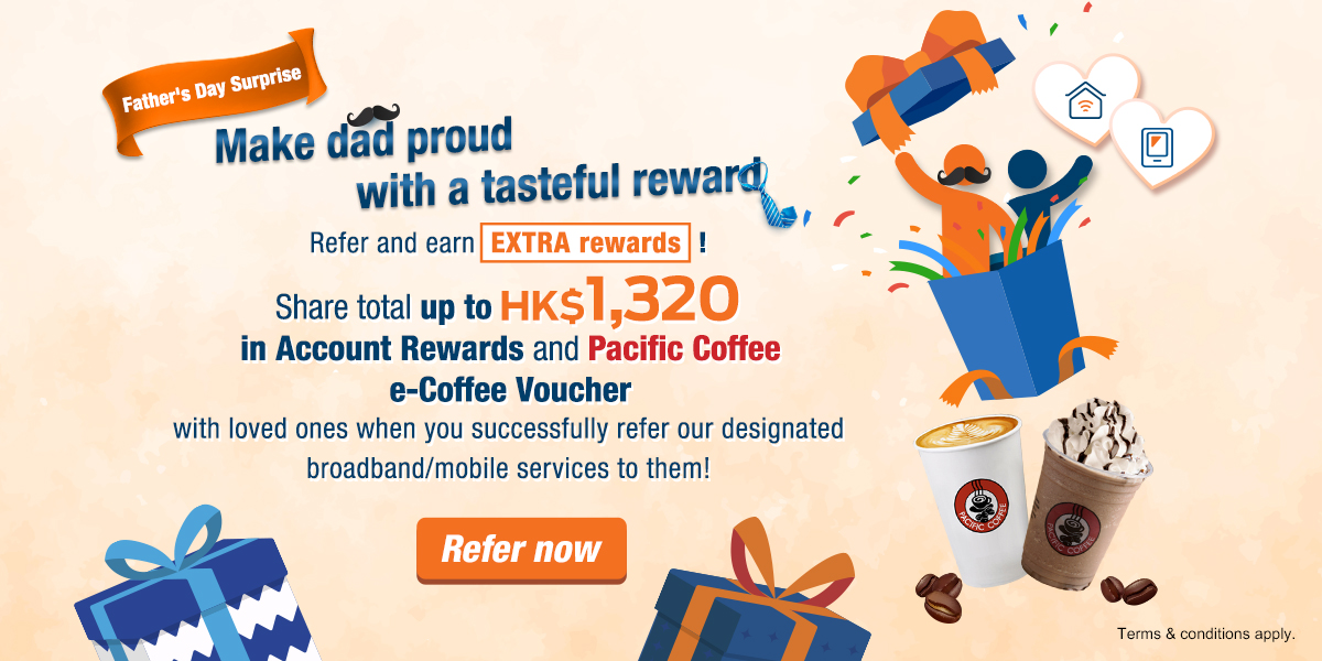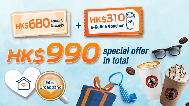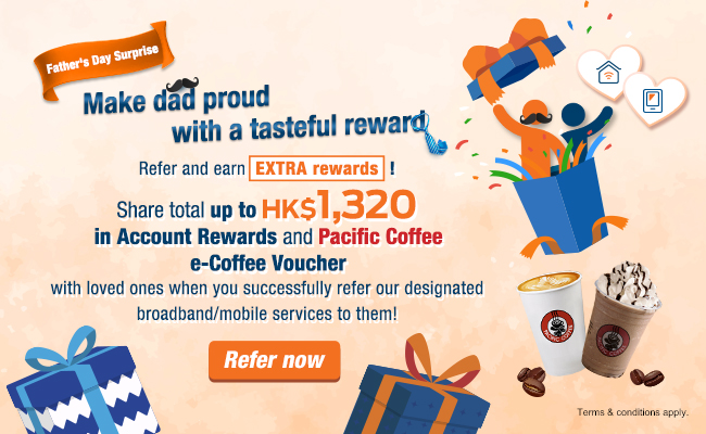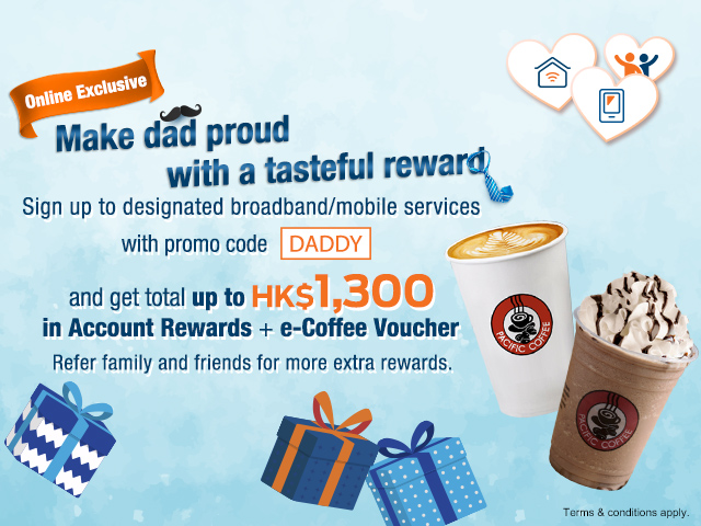 Sign up to designated broadband/mobile services with promo code 'DADDY' and get total up to HK$1,300 in Account Rewards + e-Coffee Voucher.
